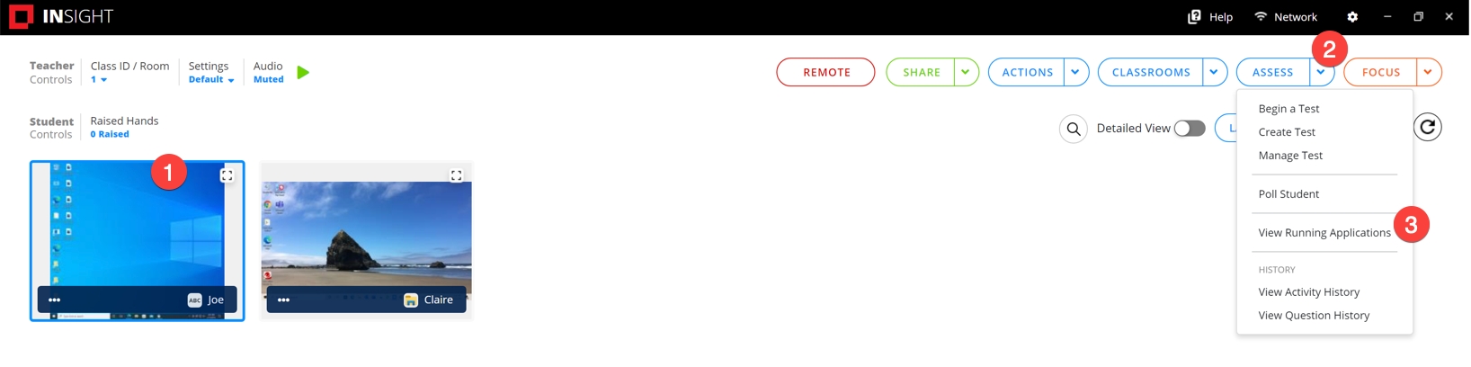 Je kunt de huidige actieve toepassingen op de computer van een student bekijken via het menu Beoordelen.
