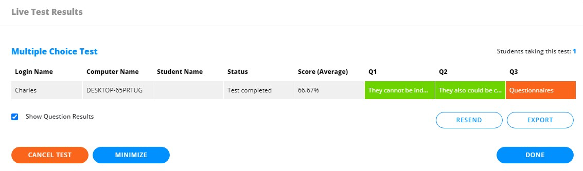 Het venster Live toetsresultaten biedt docenten een overzicht van de lopende toets en geeft informatie meer zoals hoeveel studenten de toets doen, de status van de toets voor elke student (Wachten, Toets wordt uitgevoerd, Toets voltooid, Toets geannuleerd), en de score (gemiddeld) voor elke student.
