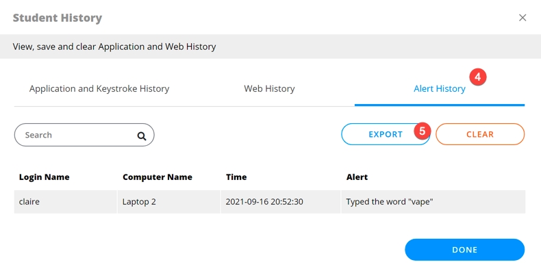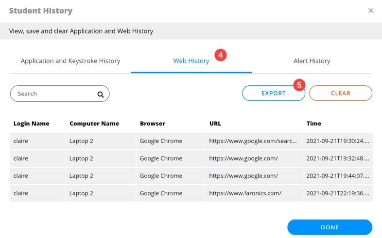 Docenten kunnen de activiteitsgeschiedenis van studenten in de les bekijken. Hieronder vallen de gebruikte apps en de toetsaanslagen in de toepassing, de webgeschiedenis (waaronder alle bezochte websites, zelfs in de in-cognito/privémodus als die is ingeschakeld; je vindt meer info in Webfilters), en een geschiedenis van de meldingen (waaronder meldingen van verboden woorden/activiteiten)