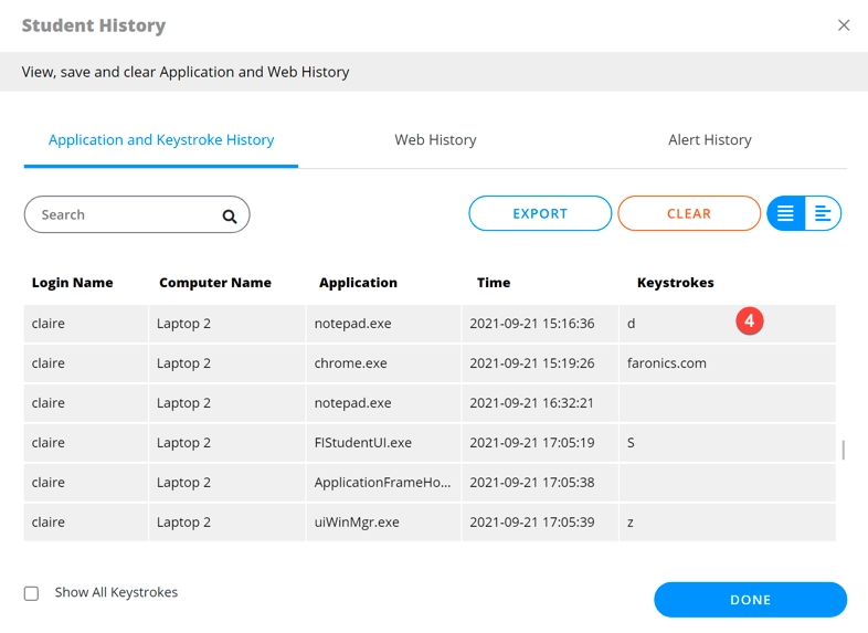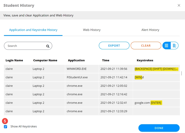 Toont een doorzoekbare lijst met alle toetsaanslagen van de student. Klik op Exporteren om de lijst als bestand op te slaan.