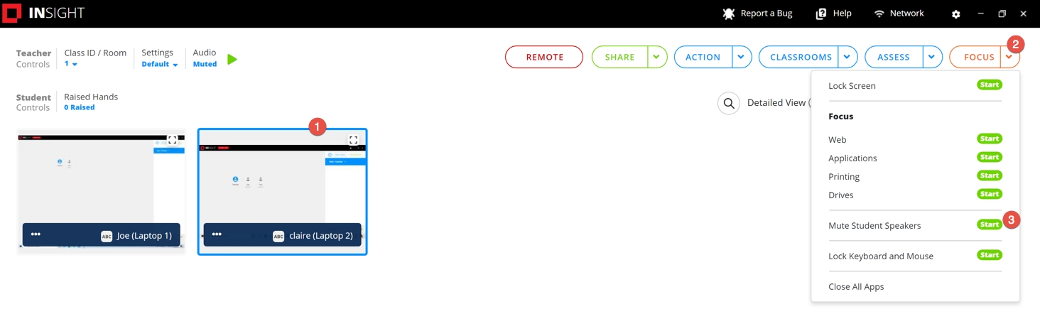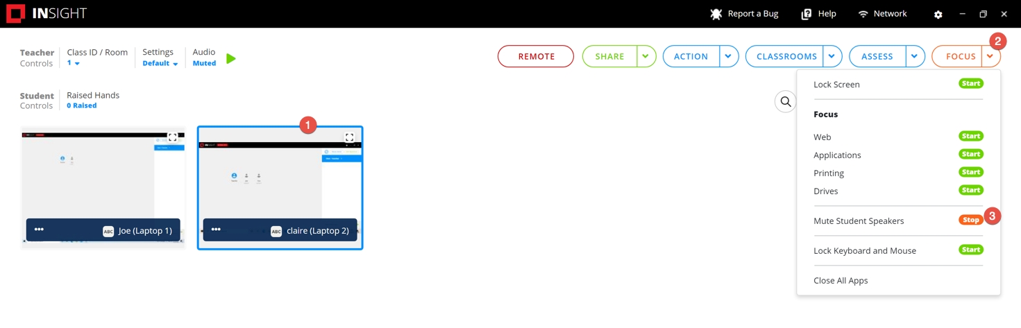 Klik op Starten naast de optie Speakers studenten dempen.