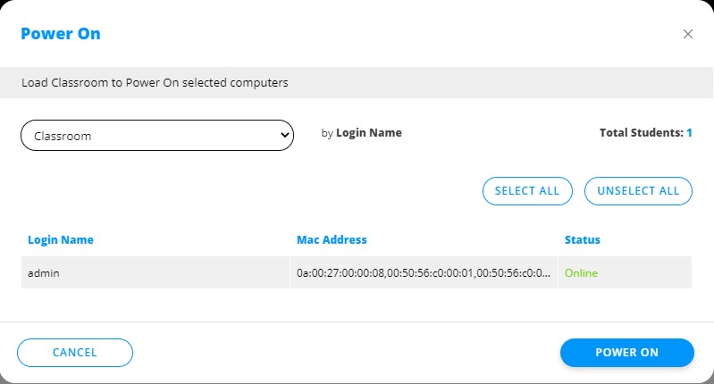 Bij deze optie kan de docent alle computers van een klaslokaal inschakelen.