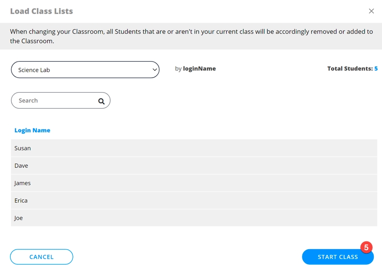 De lijst met studenten wordt voor het klaslokaal weergegeven. Klik op Les starten.