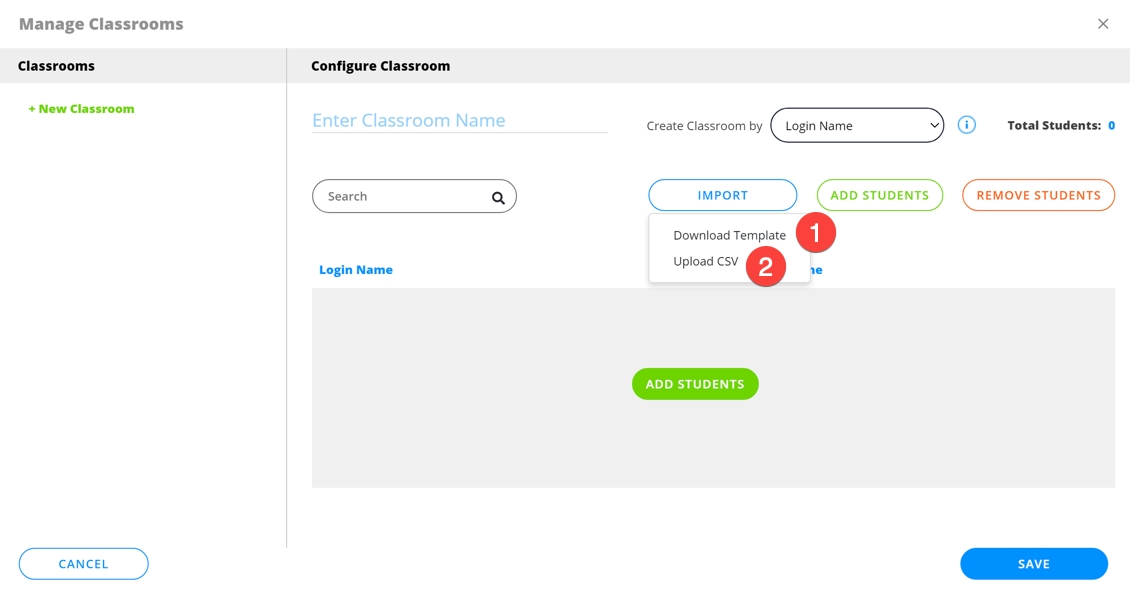 Klik op Importeren > Sjabloon downloaden om een CSV-sjabloonbestand te downloaden waarmee je klaslijsten kunt maken.