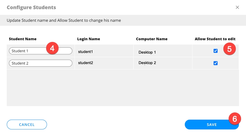 Schakel eventueel Student laten bewerkenin. Als dit is ingeschakeld, kunnen studenten de namen wijzigen van hun computers.