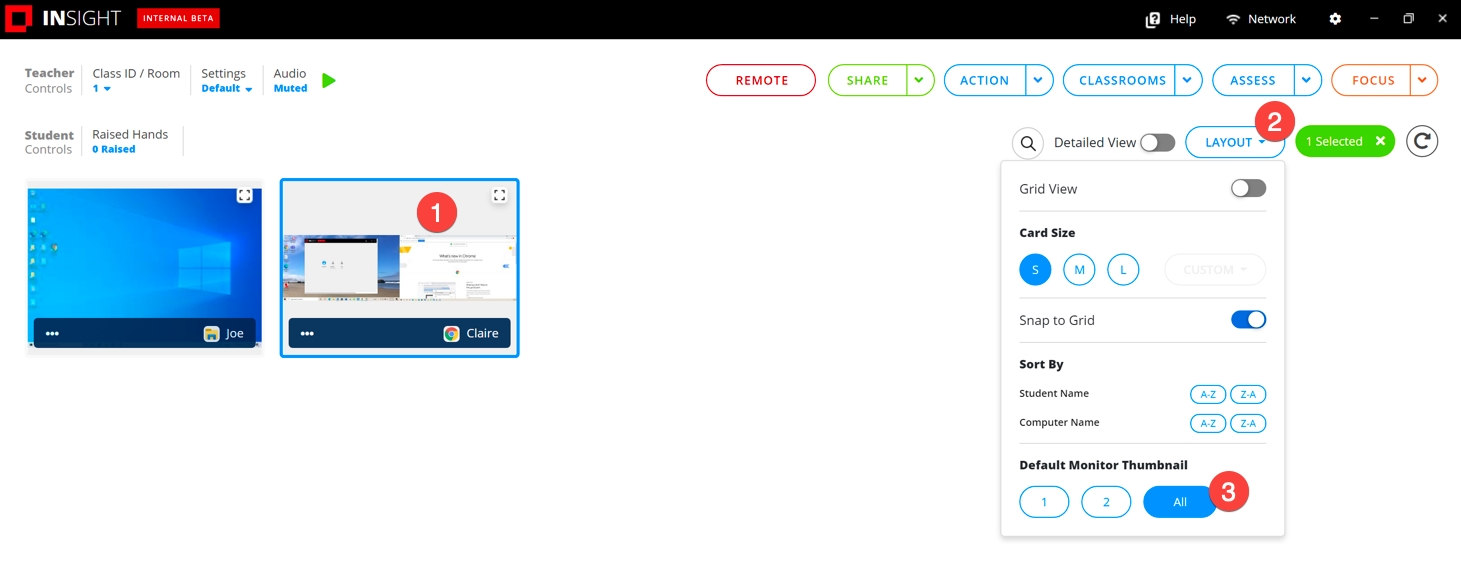Met de miniatuur standaardmonitor kunnen docenten kiezen of ze een monitor (1 of 2) of alle geselecteerde studentencomputers willen weergeven als een student meerdere monitors met diens computer heeft verbonden.