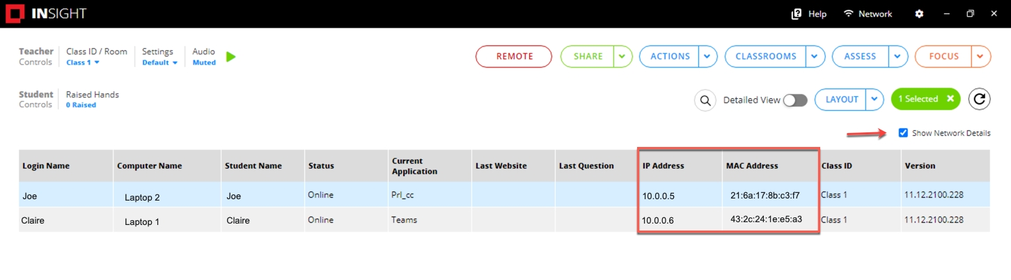Klik op Netwerkgegevens weergeven om het IP-adres en het MAC-adres te tonen voor elke studentencomputer.