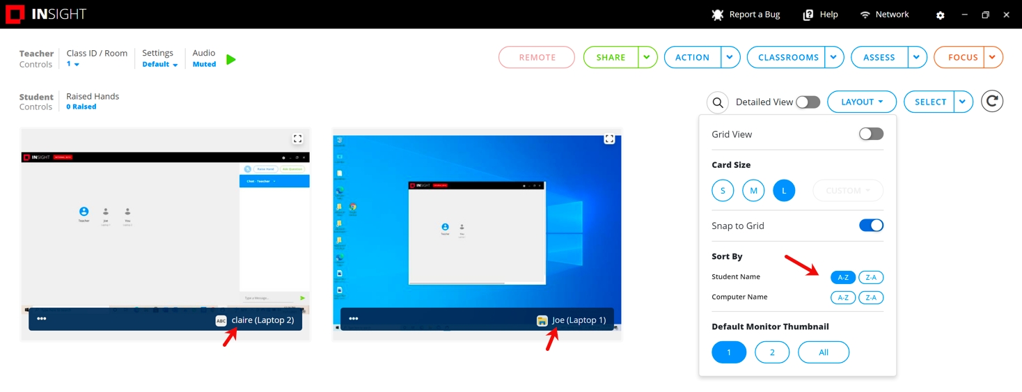 Docenten kunnen studenten weergeven op aanmeldingsnaam, studentennaam of computernaam, in oplopende of aflopende volgorde.