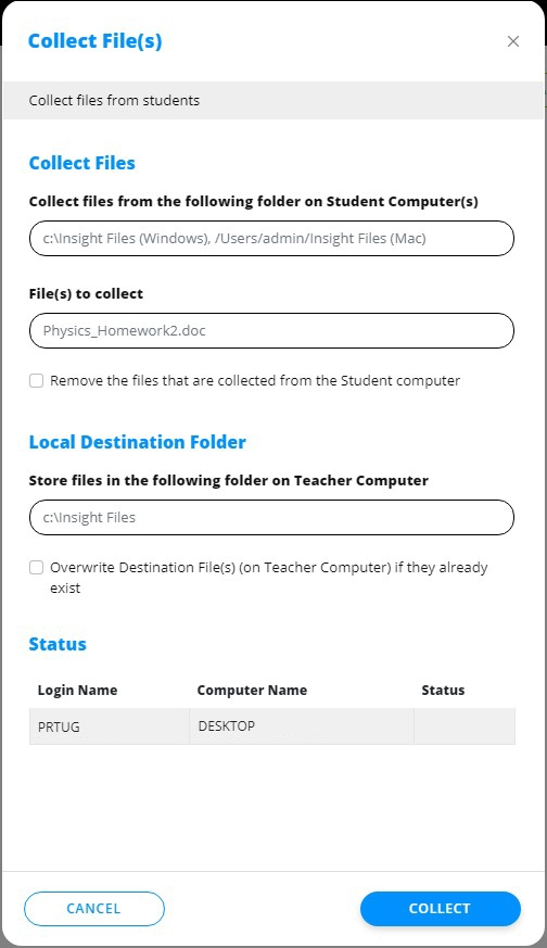 Schakel eventueel de optie Verwijder de bestanden die zijn verzameld van de studentencomputer in. Als dit is ingeschakeld, worden na de overdracht de bestanden verwijderd van de computer van de bestand.