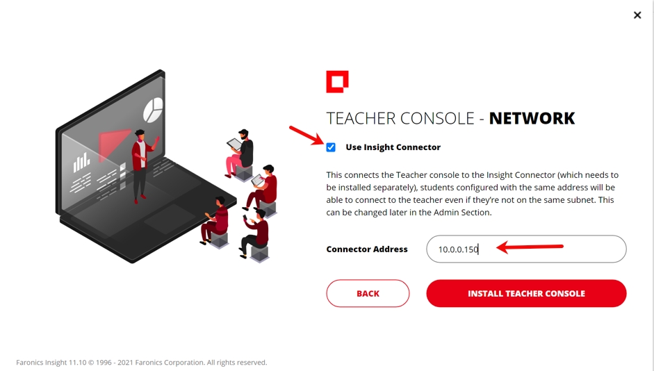Het IP-adres, de hostnaam of de FQDN van Insight Connector kan worden geconfigureerd tijdens de installatie van Insight op de computer van de docent, zoals hieronder wordt afgebeeld.