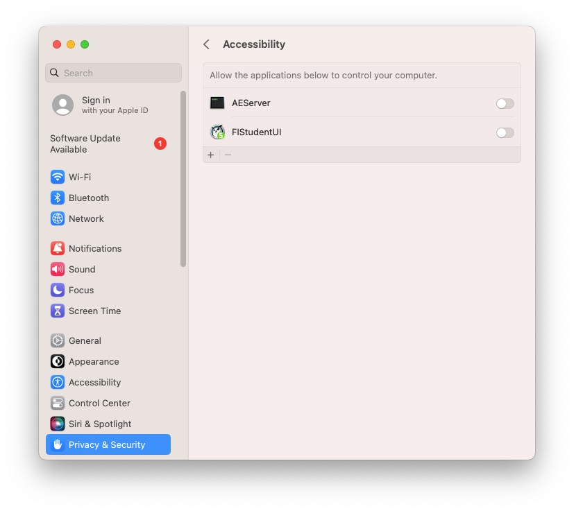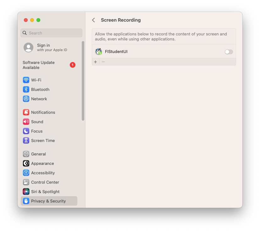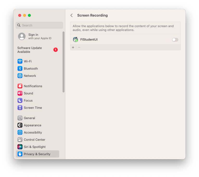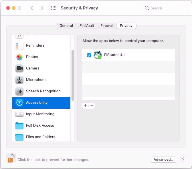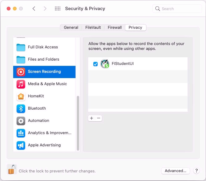 Op macOS Monterey en oudere systemen: Klik op Open systeemvoorkeuren en schakel FIStudentAgent.app (onder Privacy) in aan de rechterkant om Toegankelijkheid en Schermopnamen toe te staan.