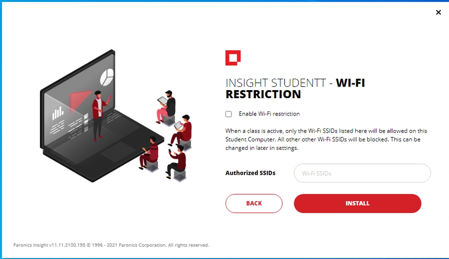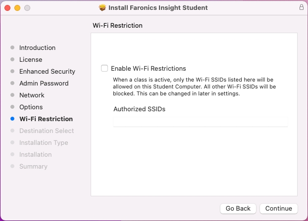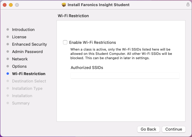 De optie om wifi te beperken wordt weergegeven. Voer de lijst met geautoriseerde SSID’s in om deze functie in te schakelen. Klik op Installeren.