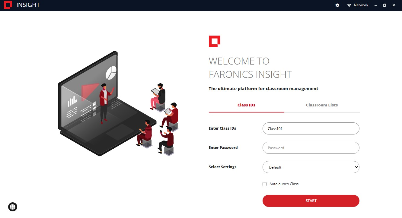 En cliquant sur l'icône Insight Teacher, la console Teacher de l'enseignant se charge, vous autorisant à saisir votre identifiant de classe, vos listes de classes, votre mot de passe et à choisir les paramètres par défaut avec lesquels votre classe sera lancée.