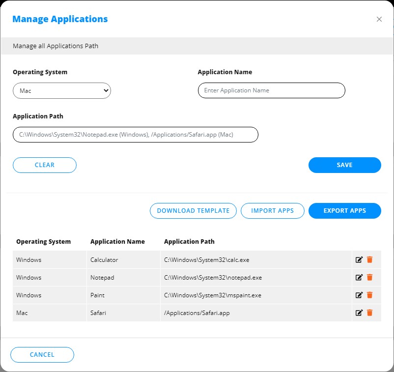 Geben Sie den Pfad für die Anwendung ein (z. B.: C:\Windows\System32\Notepad.exe für Windows oder /Applications/Safari.app für Mac).