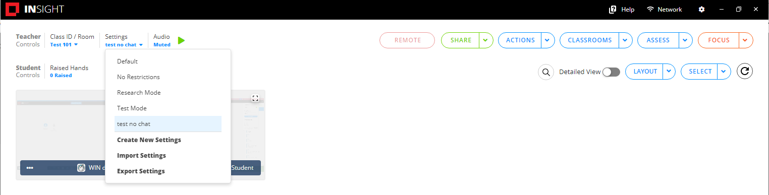 Über das Menü Einstellungen können Sie die Einstellungen für eine Klasse konfigurieren. Es enthält auch einige vordefinierte Einstellungen, die Sie unverändert verwenden oder anpassen können. Siehe [Vorprogrammierte Einstellungen](https://docs.faronics.com/faronics-insight-docs/german/faronics-insight-verwenden/die-insight-lehrerkonsole/einstellungen/vorprogrammierte-einstellungen).