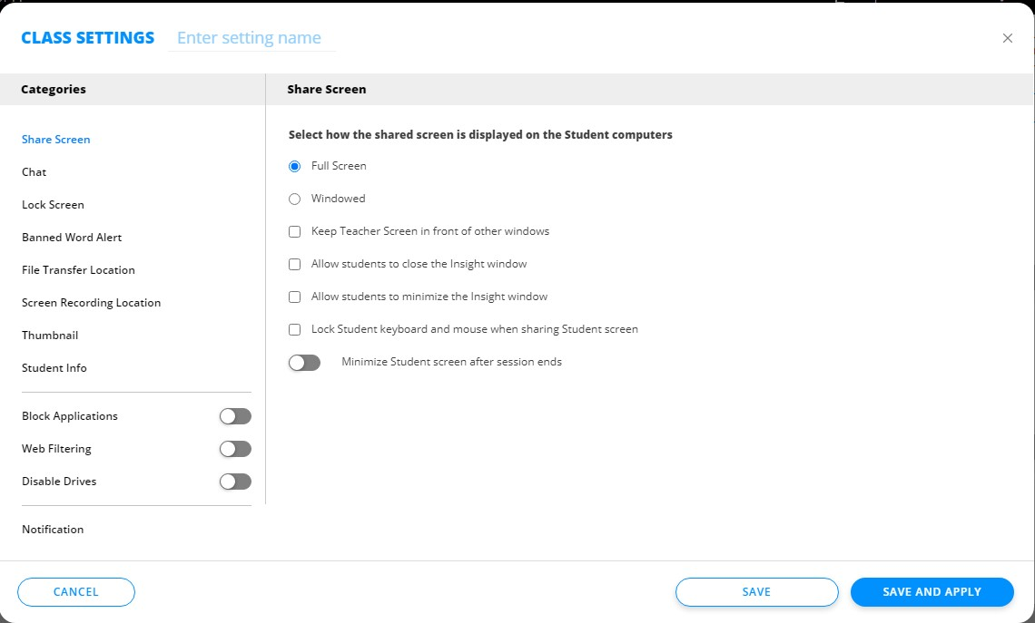 フルスクリーン - 教師の画面が学生の画面上に表示されます。画面共有時、生徒はマウスとキーボードをコントロールすることができません。
