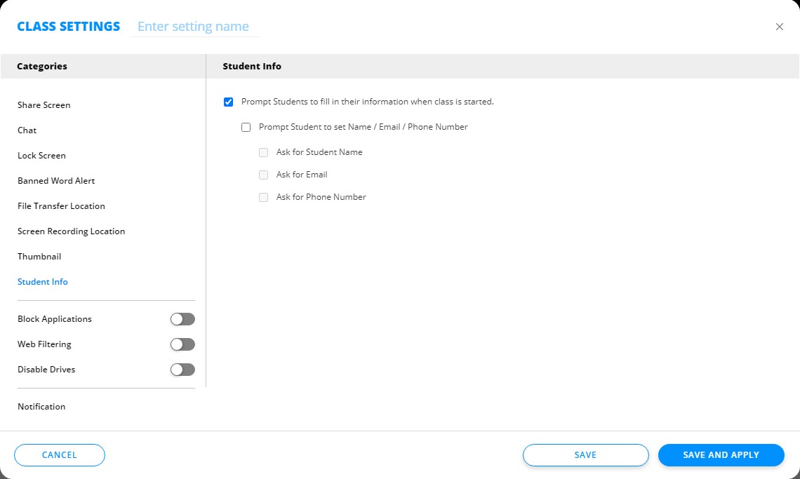 このオプションを有効にすると、クラス開始時に生徒の名前、電子メール、電話番号の入力を促すメッセージが表示されます。